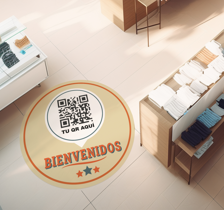 La alfombra de vinilo circular Bienvenidos con qr es fácil de limpiar con un paño húmedo o una aspiradora suave. Su resistencia a los arañazos y su superficie antideslizante la hacen ideal para áreas de alto tráfico. ¡Mantén tu tienda luciendo impecable con este producto de diseño único!