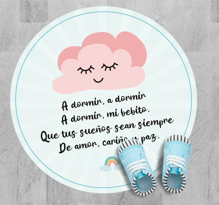 Tierna alfombra vinílica para bebé con la letra de una muy conocida canción de cuna "e;A dormir, a dormir bebito"e;. Sobre la divertida tipografía aparece una linda nube con cara amigable. Esta alfombra para habitación infantil viene en forma circular y en diferentes medidas para encajar en el espacio que gustes. Está hecha con excelente materiales para ser antialérgica y resistente al agua, de modo que puedas lavarla sin temor a que pierda cualidades o la definición mate de sus colores. También ofrecemos complementos para fijarla al piso si así lo deseas.