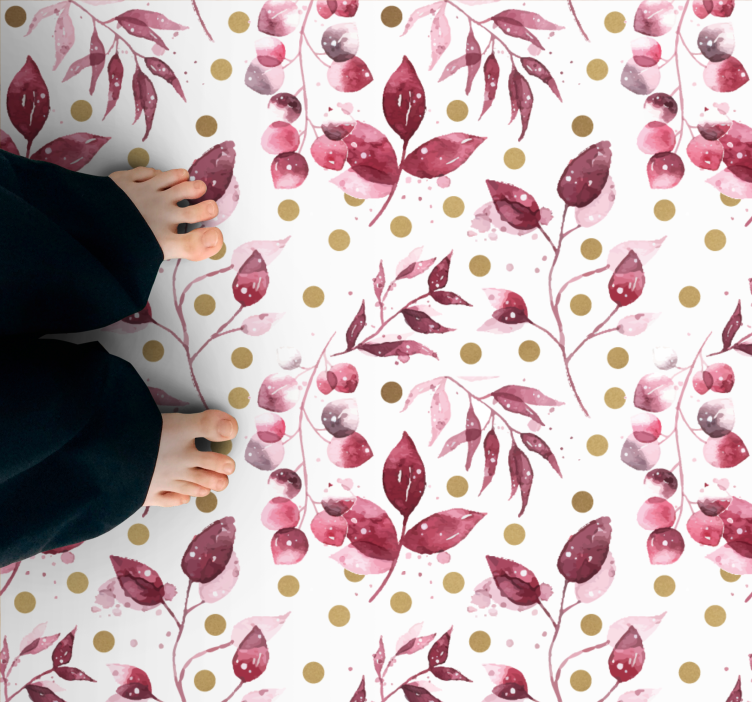 La alfombra vinílica flores estampado botánico es una obra de arte en tu hogar. Su diseño vibrante incluye un hermoso fondo en borgoña, con ilustraciones pintadas a mano que combinan hojas y flores en tonos de rosa, rosado, verde y acentos en oro. Este patrón de acuarela captura la esencia de la naturaleza, convirtiendo cualquier espacio en un rincón acogedor y lleno de vida.