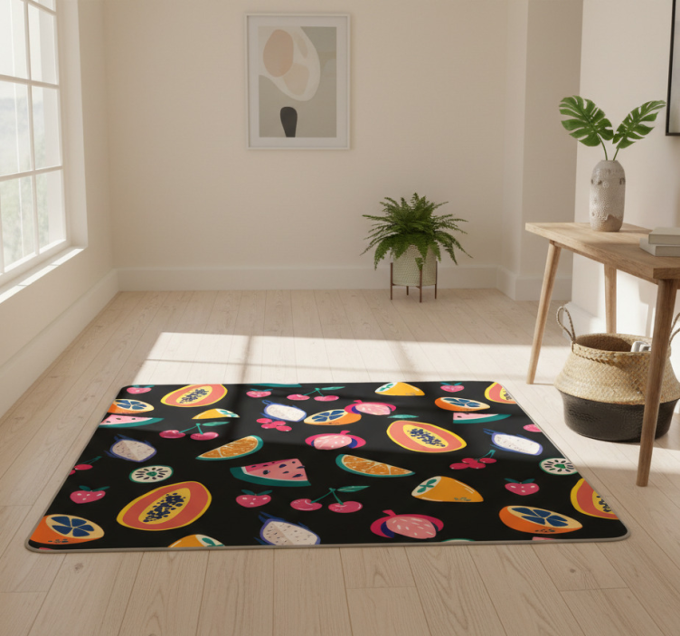 Alfombra vinílica naturaleza frutas multicolores sobre negro