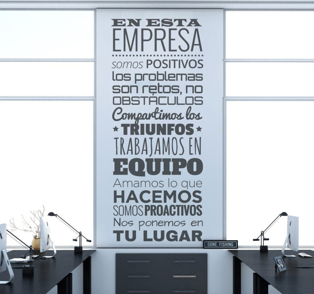 Un truco que recomendamos en Tenvinilo es combinar vinilos grandes con vinilos pequeños para crear equilibrio visual. Por ejemplo, un vinilo grande detrás del escritorio principal y pequeños detalles alrededor de la sala de reuniones puede darle personalidad sin sobrecargar el espacio.