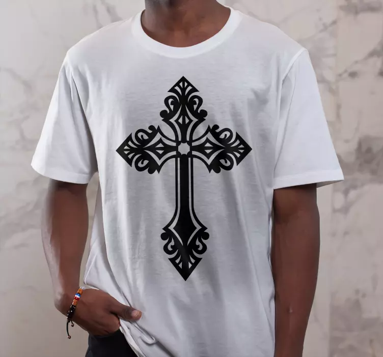 Camiseta en monocolor blanca con diseño de cruz con motivos decorativos. si es un apasionado de las cruces en su armario no puede faltar esta prenda en el. Luzca esta cruz con elegancia y orgullo. El tallaje es pequeño por ello aconsejamos que antes de realizar el pedido compruebe nuestra guía de tallas para verificar cual es la que se ajusta más a su estilo. El material utilizado para el tejido es 100% algodón por lo que son cómodas y suaves. Para su lavado recomendamos que se le de la vuelta y con agua fría o que no supere los 30º.