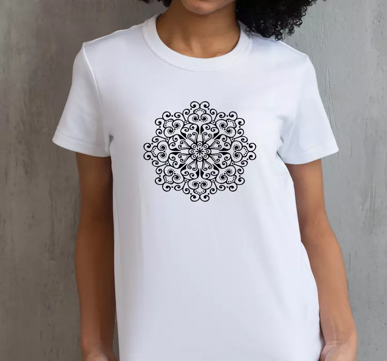 Camiseta flor con la ilustración de un mandala. Disfruta en tu camiseta personalizada de una decoración refinada y elegante con la que conocer la evolución del cosmos respecto a un punto central, según la visión del budismo. Una camiseta original con un diseño ideal tanto para ropa mujer como para moda infantil.