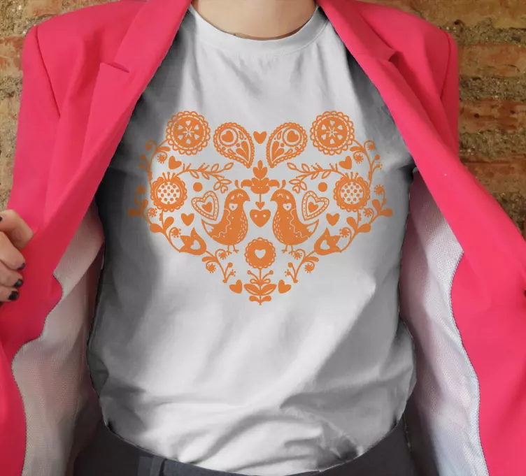 Descubre la camiseta pájaros con patrón de corazones, una obra de arte que fusiona el polaco folklore con un diseño lleno de vida. Este encantador diseño presenta aves en vuelo rodeadas de flores y corazones, evocando el amor y la tradición en blanco y negro. Ideal para quienes buscan un estilo único y alegre, esta camiseta es más que una prenda, es una celebración de la vida y la naturaleza.
