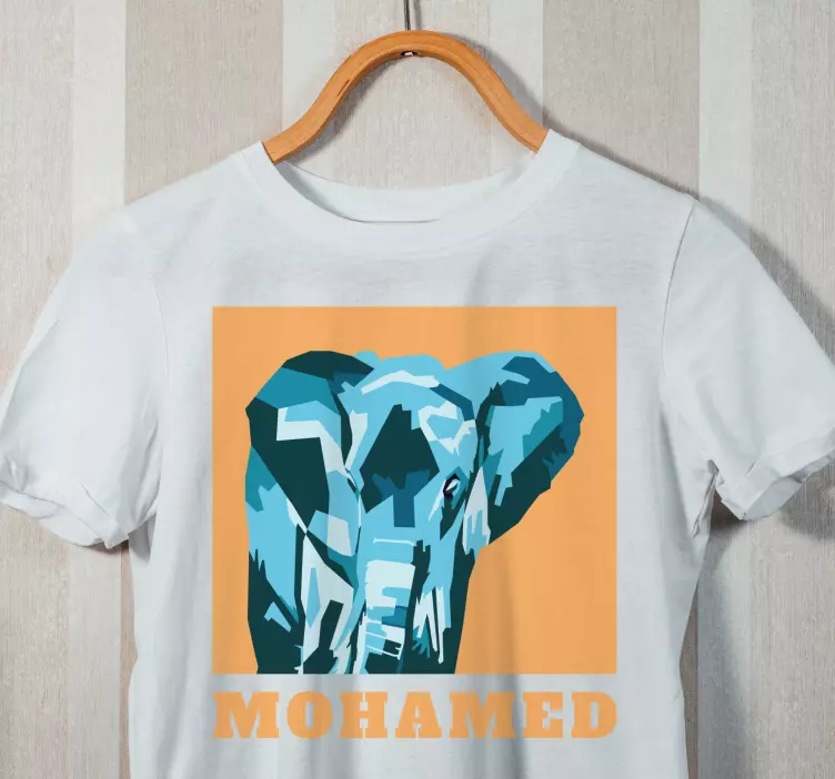 Referencia: T4979Este diseño presenta un impresionante retrato de un elefante creado con vibrantes formas geométricas. La paleta de colores incluye varias tonalidades de azul complementadas por un fondo naranja, lo que lo convierte en una pieza cautivadora. El nombre 'Mohamed' se muestra de manera prominente, añadiendo un toque personal.
