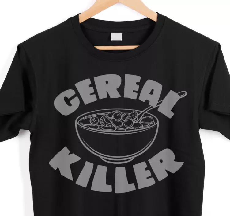 La camiseta tema amante de los cereales es una pieza única que combina un diseño gracioso con un toque de humor juguetón. Su gráfica presenta un cuenco de cereal que, con un giro inesperado, se convierte en la imagen de un asesino, creando un retruécano visual que hará sonreír a todos. El fondo negro resalta este ingenioso diseño, ideal para los amantes de la comida que disfrutan de un toque de diversión en su vestimenta.