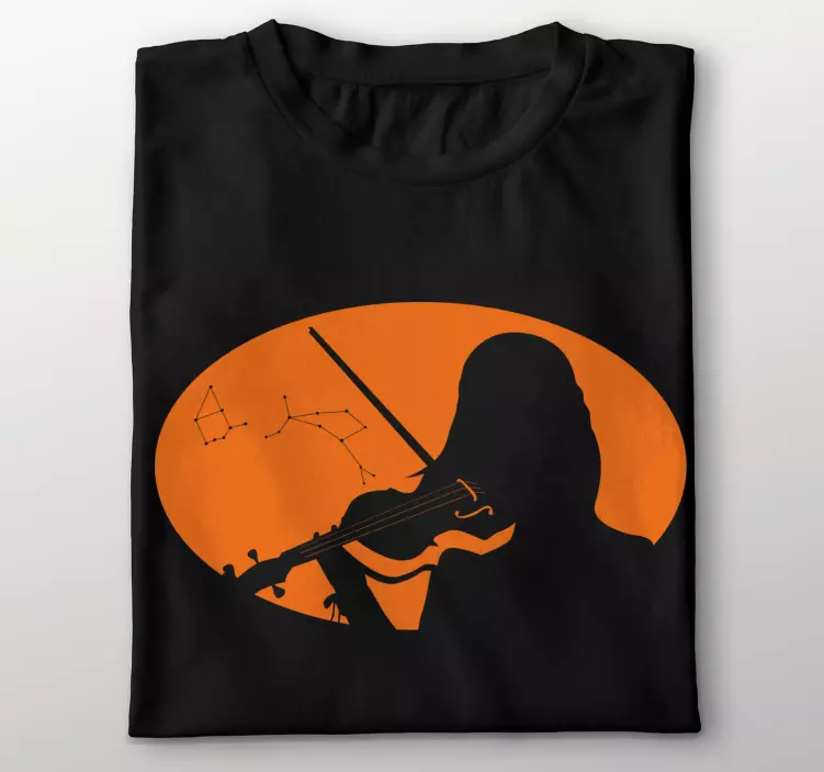 Referencia: T4530Este diseño impactante presenta la silueta de un violinista bajo un cielo estrellado con constelaciones de fondo. El vibrante círculo naranja contrasta maravillosamente con la tela negra, lo que lo convierte en una elección perfecta para los amantes de la música. Ideal para ocasiones especiales o para uso casual.