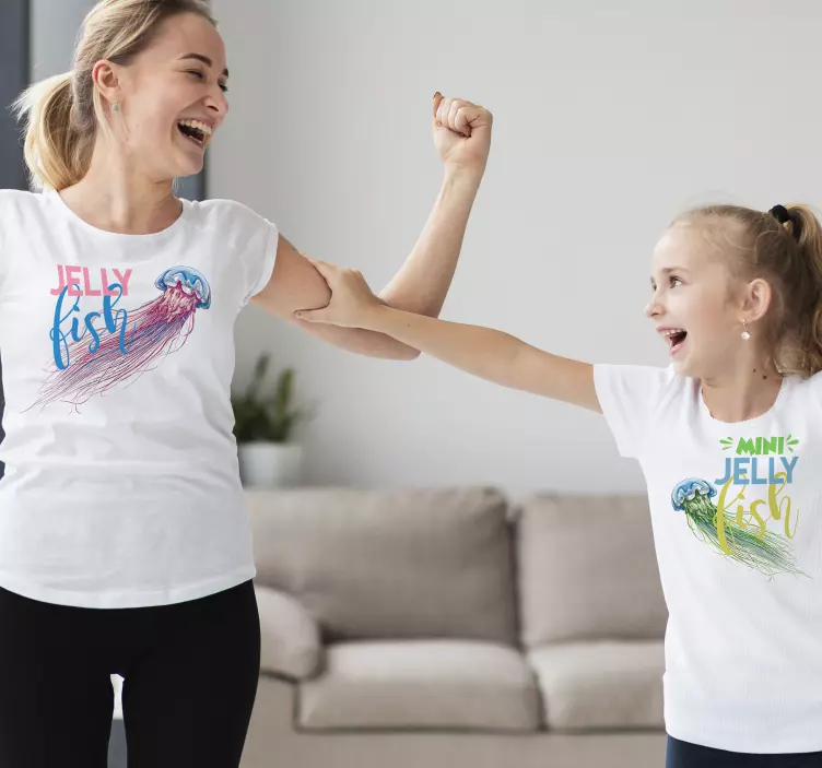 Referencia: T5235Esta imagen animada muestra a una madre y su hija compartiendo momentos de alegría, ambas vestidas con camisetas a juego que presentan vibrantes imágenes de medusas. El diseño juguetón resalta su vínculo y crea una atmósfera divertida y colorida, perfecta para expresar amor y unión.