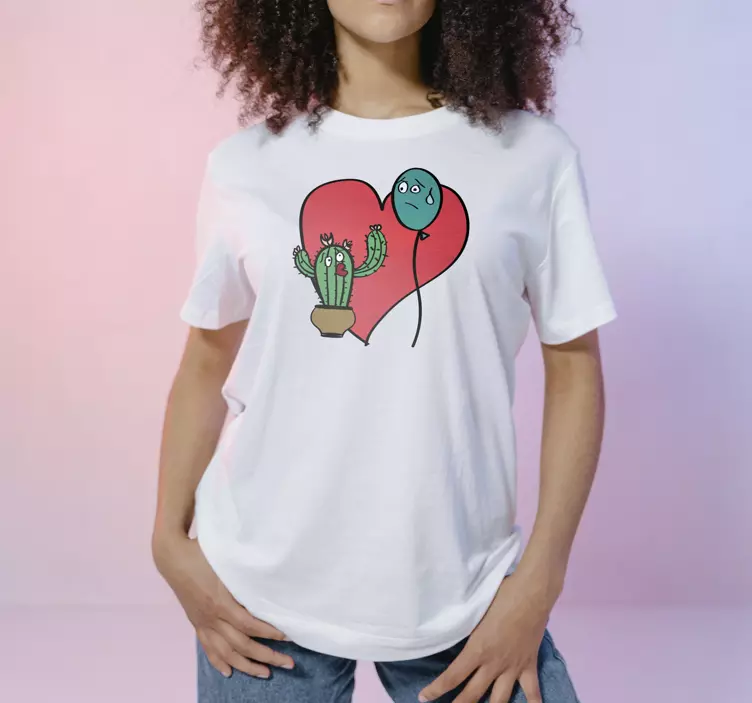 Camiseta parejas divertida amor imposible que muestra la imposibilidad de un globo y un cactus para estar juntos y