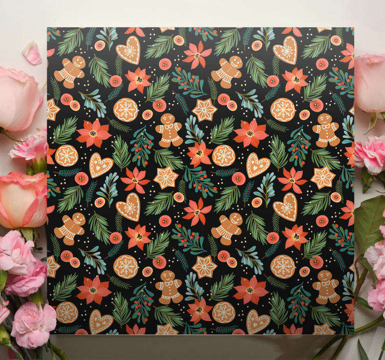 Referencia: Q6490Los elementos festivos presentan figuras de jengibre, corazones y flores de nochebuena, todos adornados con un follaje vibrante. Este patrón encapsula un alegre espíritu navideño con detalles encantadores, incluyendo estrellas decorativas y rodajas de naranja que realzan el tema estacional en general.
