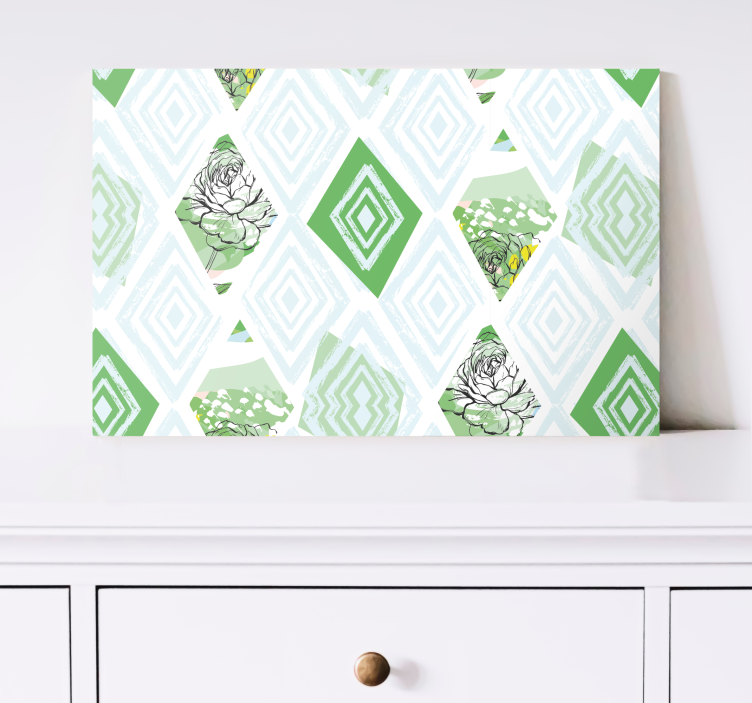 Descubre el encanto de la naturaleza con nuestro Cuadro de flores patrón geométrico de suculentas, que presenta un diseño vibrante y moderno. Este cuadro combina flores y suculentas en un patrón geométrico fascinante, donde las formas de diamante y rombo se entrelazan en tonos de verde, creando una obra abstracta que evoca la frescura de la naturaleza.