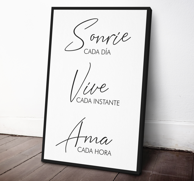 Referencia: Q5434El cuadro comedor Sonríe, Vive y Ama es una hermosa decoración para cualquier ambiente. Fácil de colgar con un sistema de colgador en la parte posterior, este cuadro para salón también se puede fijar con cinta adhesiva removible que no mancha ni daña la pared u obra con la que se coloca. Incorpora material responsable con el medio ambiente y es ligero y fácil de manipular.