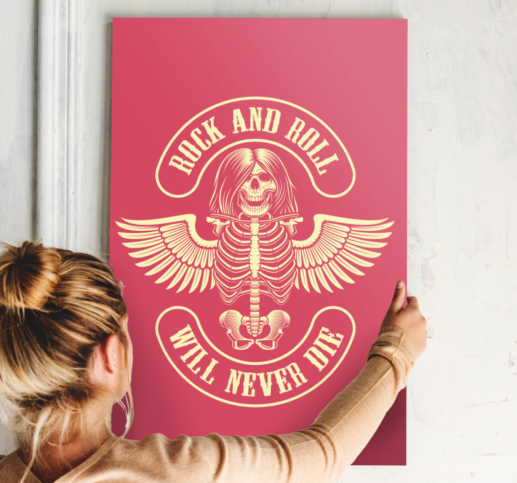 Sumérgete en el fascinante mundo del rock con nuestro Cuadro vintage leyenda del rock esqueleto. Este diseño cautivador presenta un esqueleto con alas, una estrella de rock que nunca muere, rodeado de música y un músico enérgico. La calavera y el texto vibrante te transportarán a una era donde la música era la esencia de la vida, dándole un aire único y vibrante a cualquier espacio.