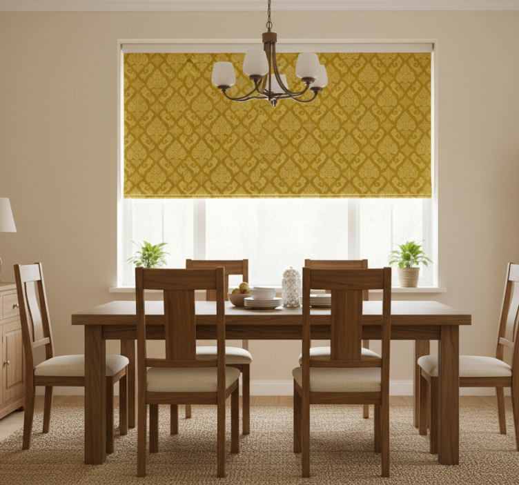 Estor enrollable amarillo con patrón floral intrincado