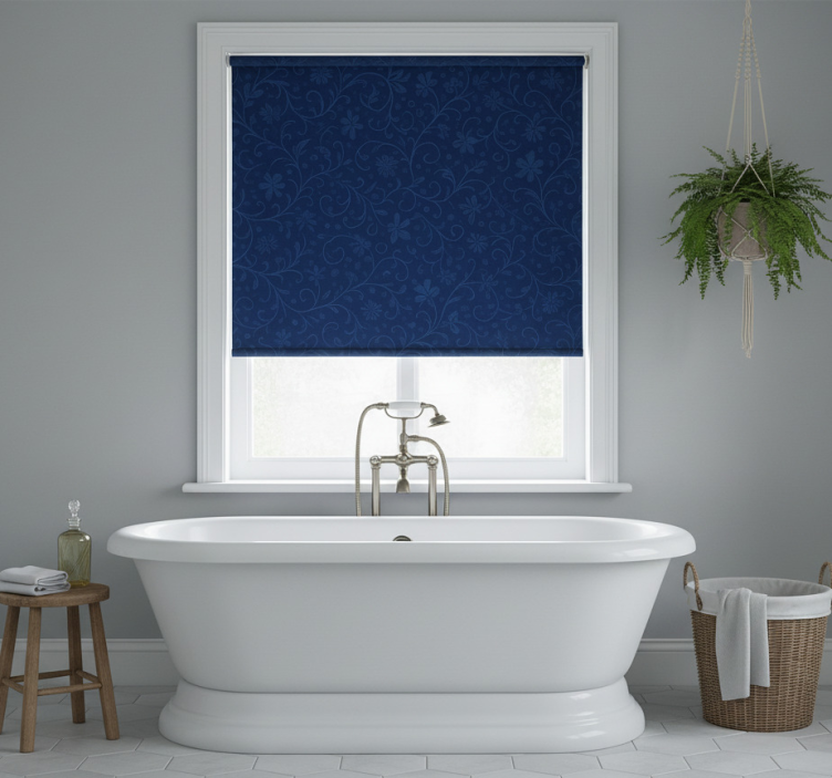 Estor enrollable azul con motivo de flores azules