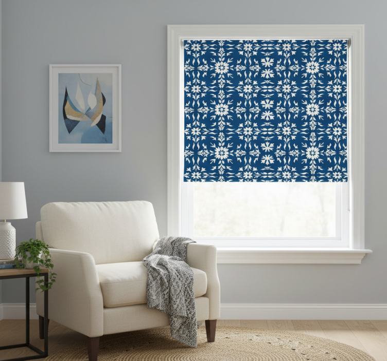 Estor enrollable azul patrón de azulejos blancos