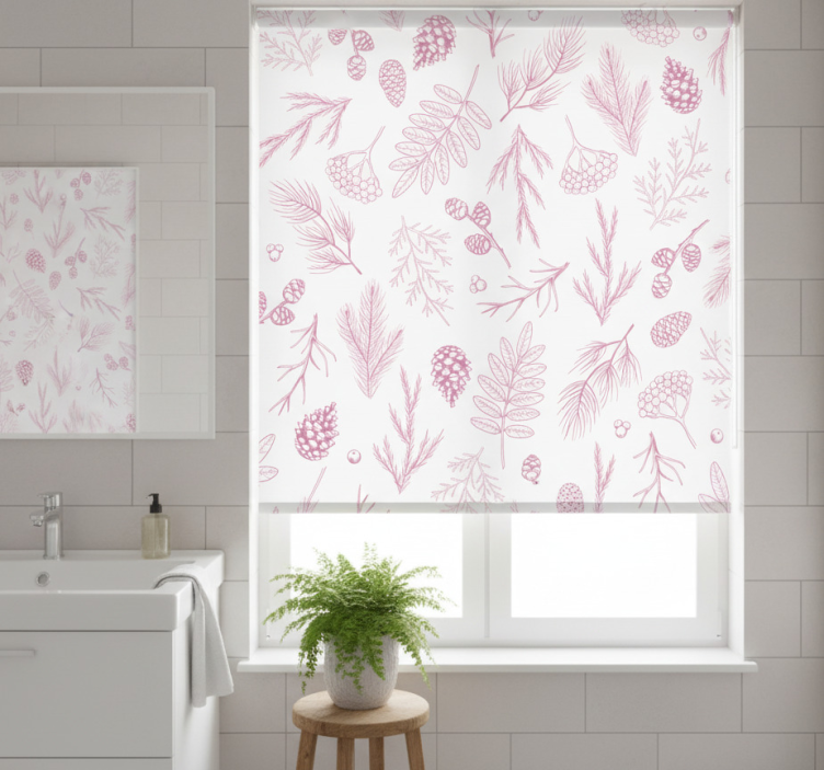 Estor enrollable baño fondo blanco con pino rosa