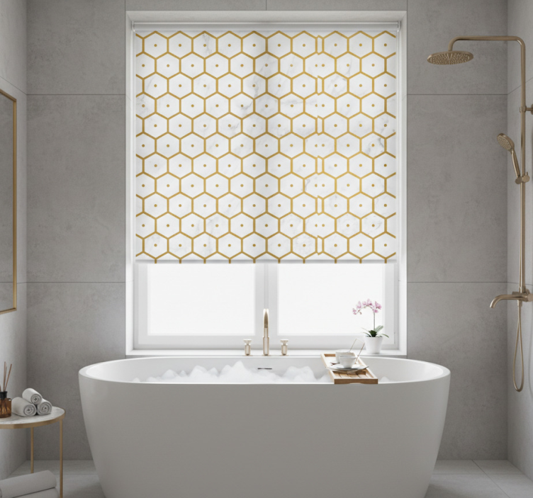 Estor enrollable baño patrón mármol hexagonal dorado
