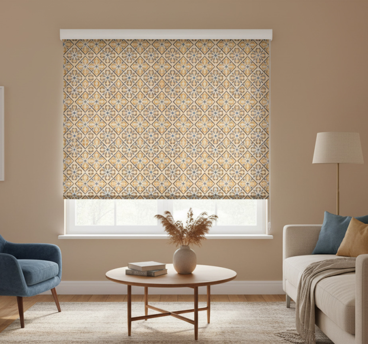 Referencia: E9823Descubre la elegancia y sofisticación de nuestro estor enrollable beige con patrón barroco dorado y azul, un diseño que combina a la perfección la calidez del beige con los lujosos detalles dorados y el fresco toque del azul. Este estor es una obra maestra que no solo embellece tu espacio, sino que también lo transforma en un refugio acogedor, ideal para cualquier habitación de tu hogar.