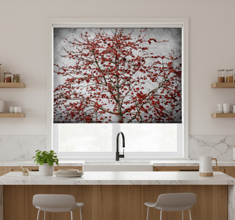 Estor enrollable cocina árbol minimalista con flores rojas