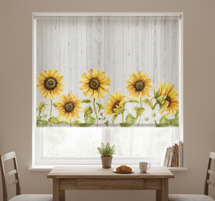 Estor enrollable cocina girasoles sobre tablones grises