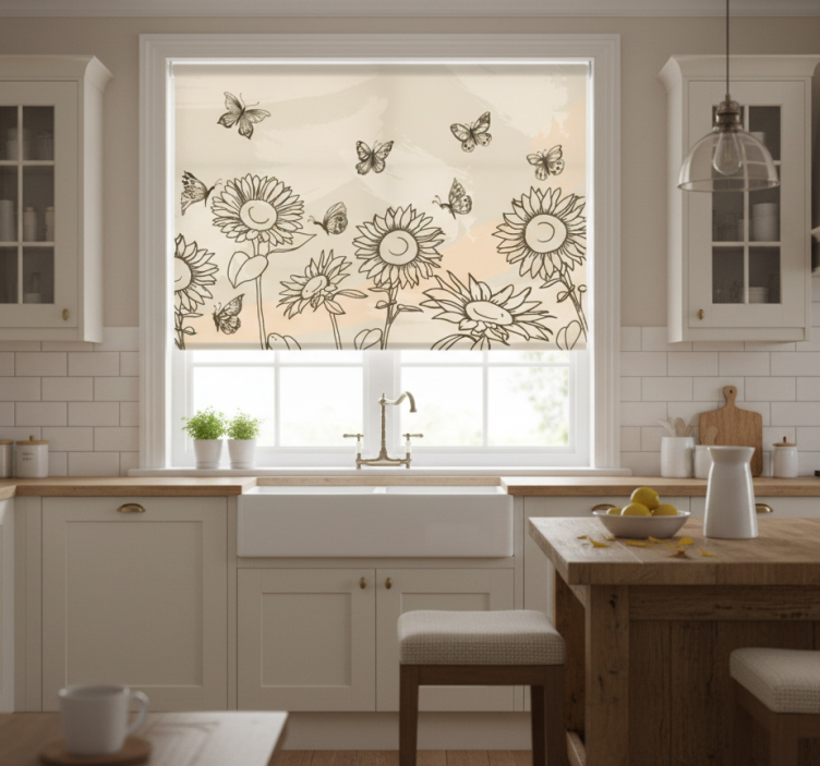 Referencia: E8365Descubre el encanto de nuestro Estor enrollable cocina girasoles y mariposas beige, un diseño que combina la alegría de los girasoles con la delicadeza de las mariposas, todo en un suave tono beige. Este estor no solo añade un toque de frescura a tu cocina, sino que también proporciona una sensación de armonía y bienestar en el ambiente. Con su estética vibrante, transformará tu espacio en un lugar acogedor y lleno de vida.