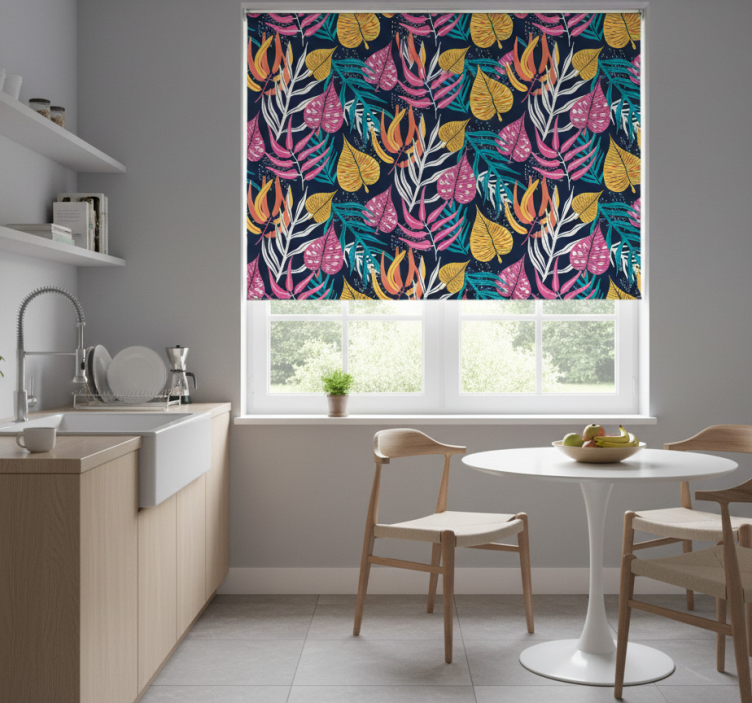 Estor enrollable cocina hojas multicolor sobre fondo azul