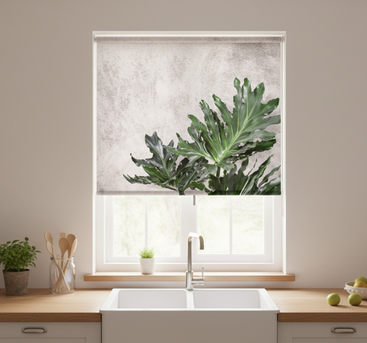 Estor enrollable cocina hojas verdes sobre fondo concreto