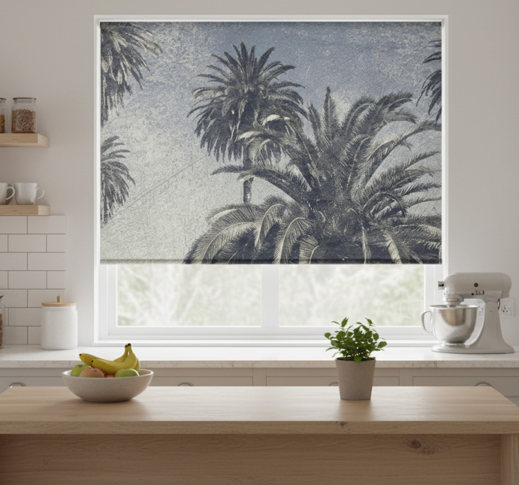 Estor enrollable cocina palmeras dibujadas en gris