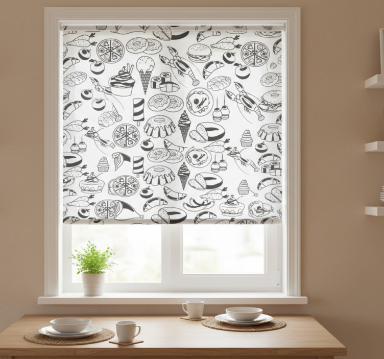 Referencia: E6291Descubre la elegancia y originalidad del Estor enrollable cocina patrón de comida blanco y negro, que destaca por su diseño gráfico llamativo y contemporáneo. Con un patrón de deliciosos alimentos en tonos blanco y negro, este estor añade un toque moderno y divertido a tu cocina, convirtiéndola en un lugar acogedor y lleno de estilo.