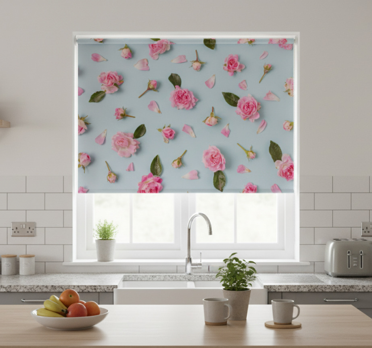 Estor enrollable cocina rosas diferentes fondo azul