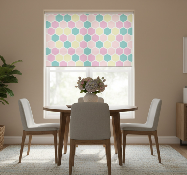 Estor enrollable comedor con patrón geométrico y colores pastel