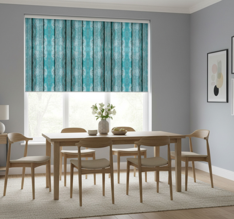 Estor enrollable comedor efecto textura madera azul