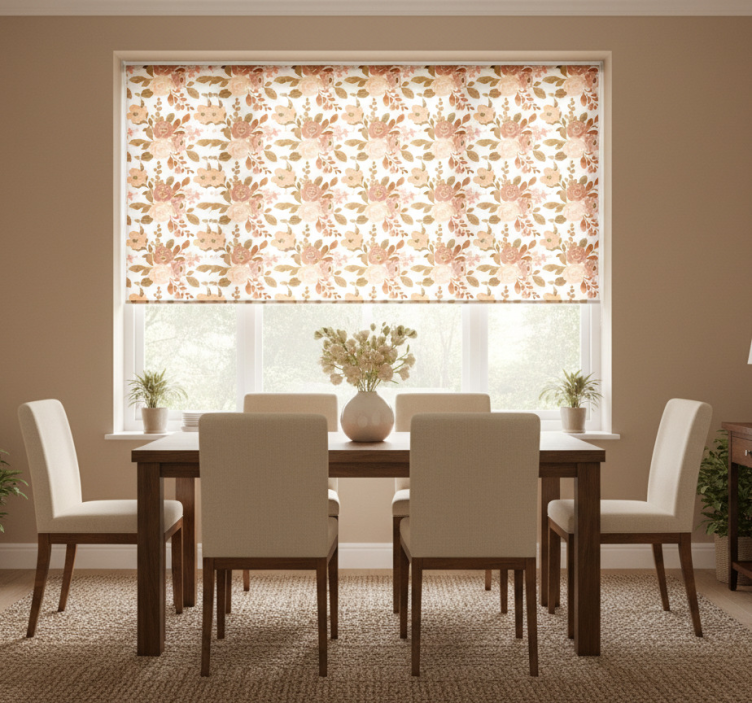 Estor enrollable comedor flores pastel rosa elegante