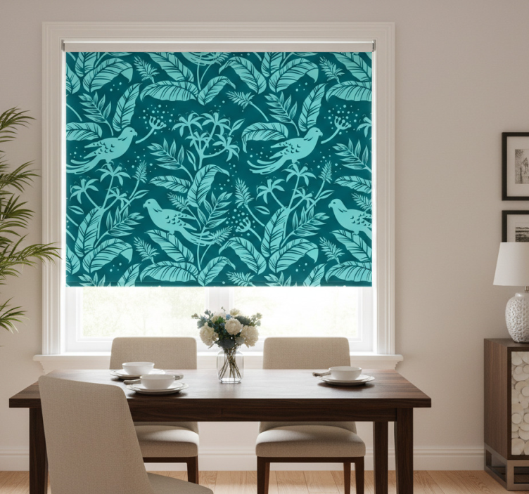 Estor enrollable comedor pájaros voladores turquesa
