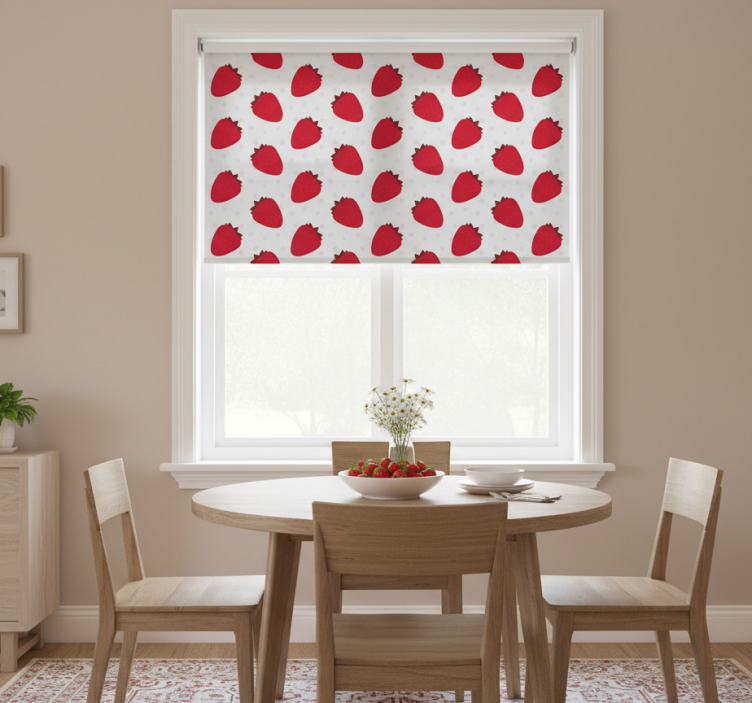 Estor enrollable comedor patrón de fresas rojas sobre blanco
