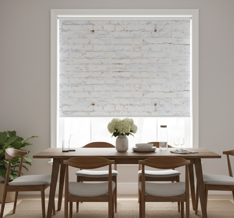 Estor enrollable comedor patrón de ladrillo blanco desgastado