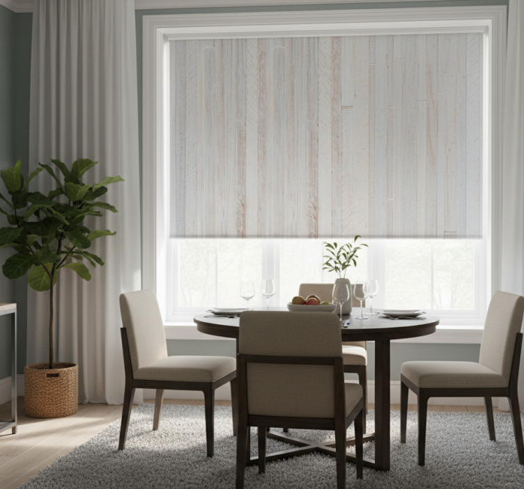Estor enrollable comedor patrón de madera gris elegante