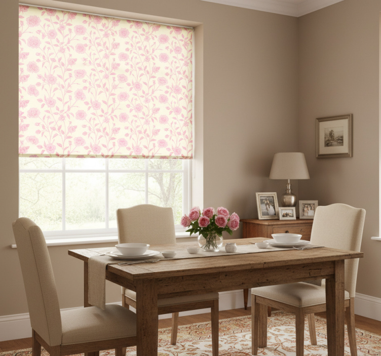 Estor enrollable comedor rosas pequeñas vintage sobre fondo rosa