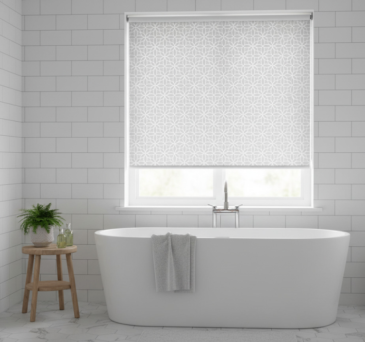 Estor enrollable gris con patrón moderno en blanco y gris