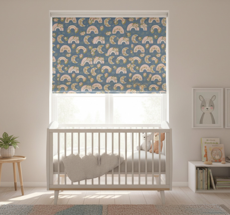 Estor enrollable infantil con patrón de arcoíris y flores