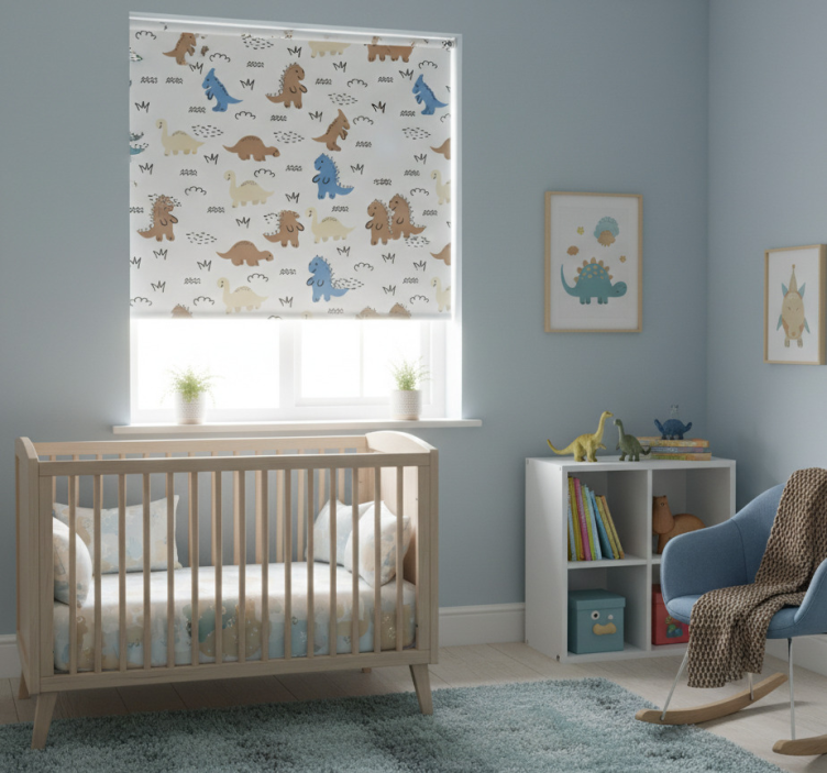 Estor enrollable infantil dinosaurios felices azules y marrones