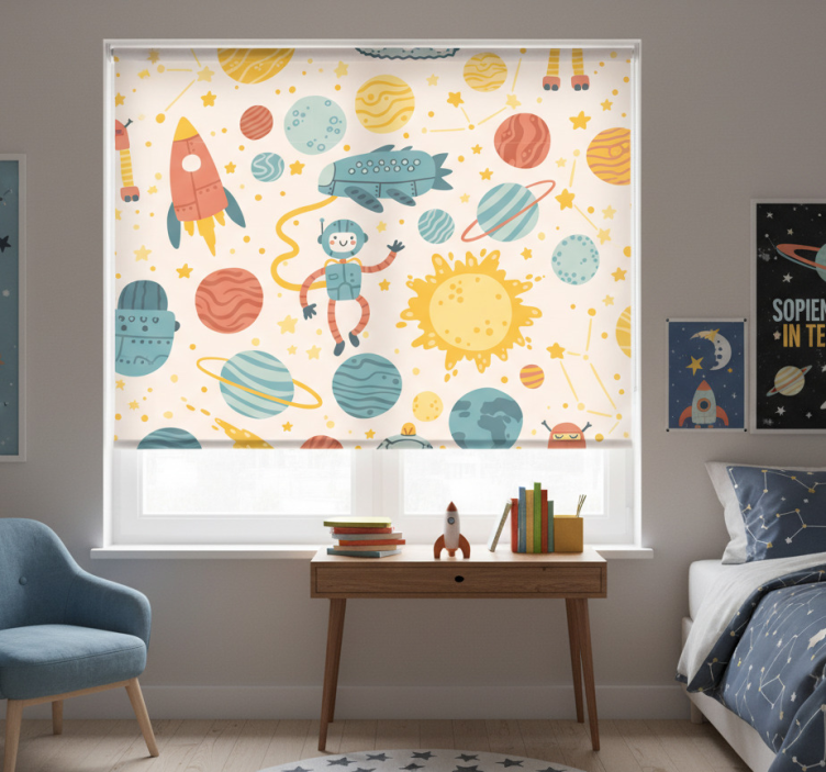Referencia: E7171Descubre el Estor enrollable infantil escena de aventura espacial, un diseño encantador que transportará a los más pequeños a un emocionante viaje por el cosmos. Con su colorido estampado de planetas, cohetes y estrellas, este estor no solo es un elemento decorativo, sino también una invitación a la imaginación y la aventura. Su estilo vibrante y alegre hará que cualquier habitación infantil se convierta en un espacio mágico y lleno de creatividad.