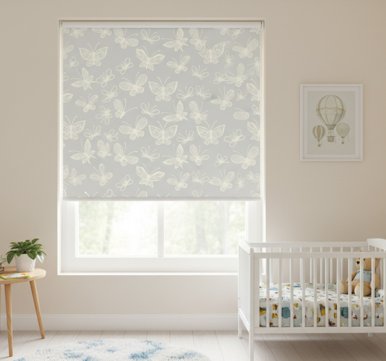 Estor enrollable infantil patrón de mariposas gris y blanco