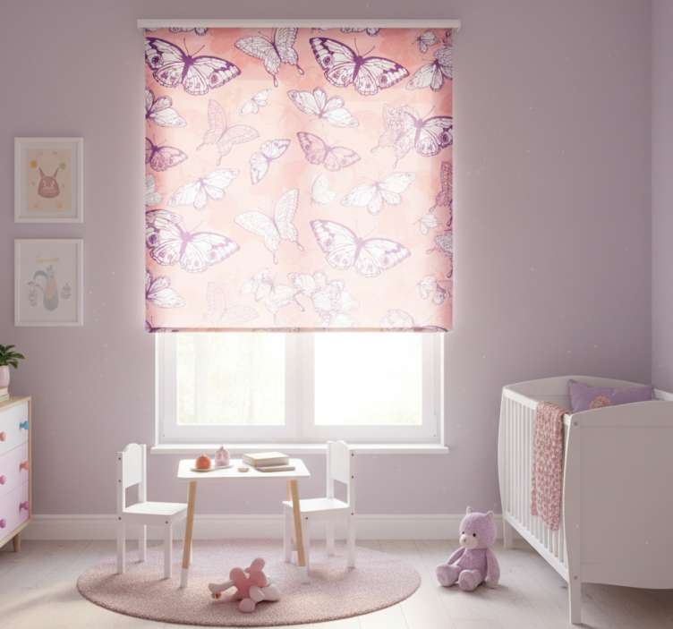 Estor enrollable infantil patrón de mariposas moradas y rosas