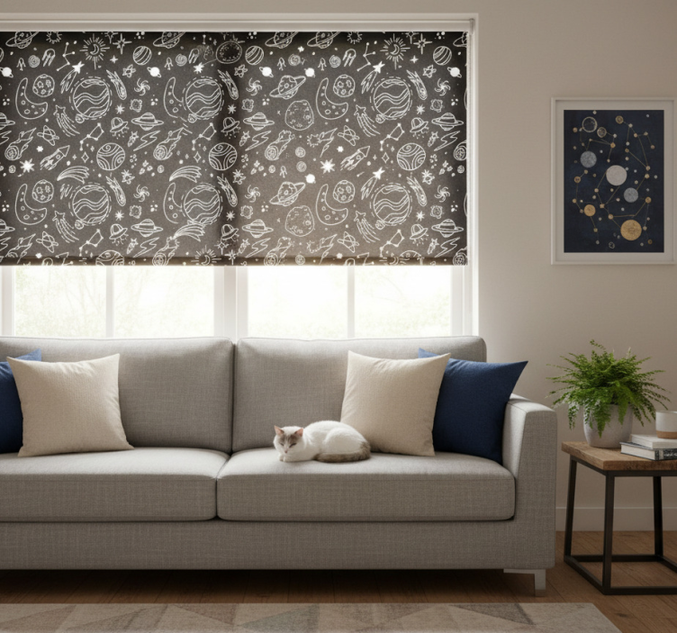 Estor enrollable moderno ilustraciones cósmicas en blanco y negro