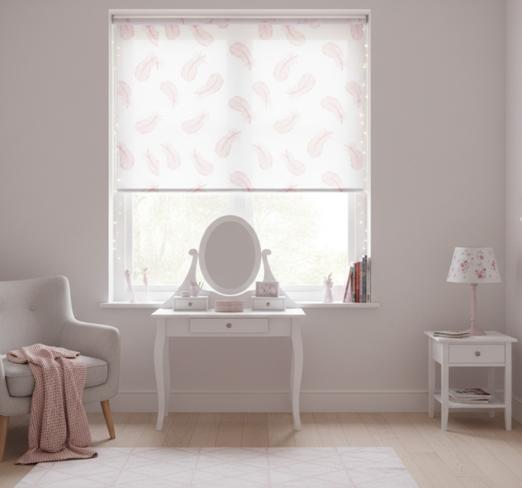 Estor enrollable rosa con patrón de plumas rosas