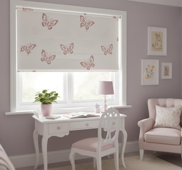 Estor enrollable rosa mariposa juguetona y revoloteante