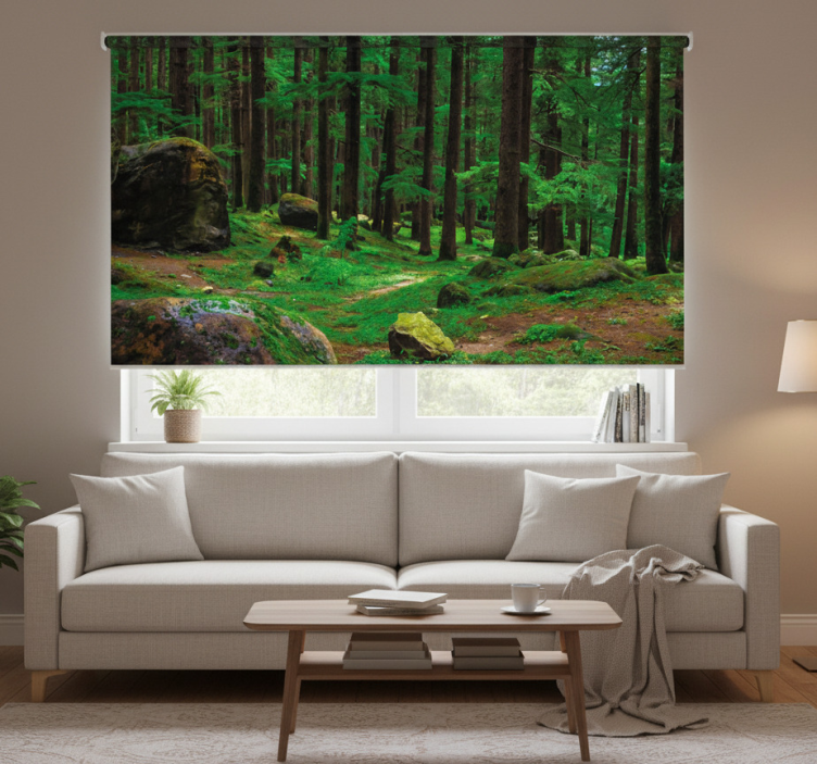 Estor enrollable salón bosque verde con árboles