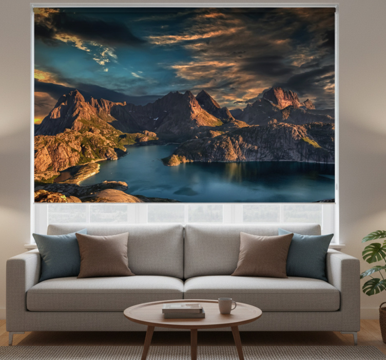 Estor enrollable salón paisaje noruego mar y montañas